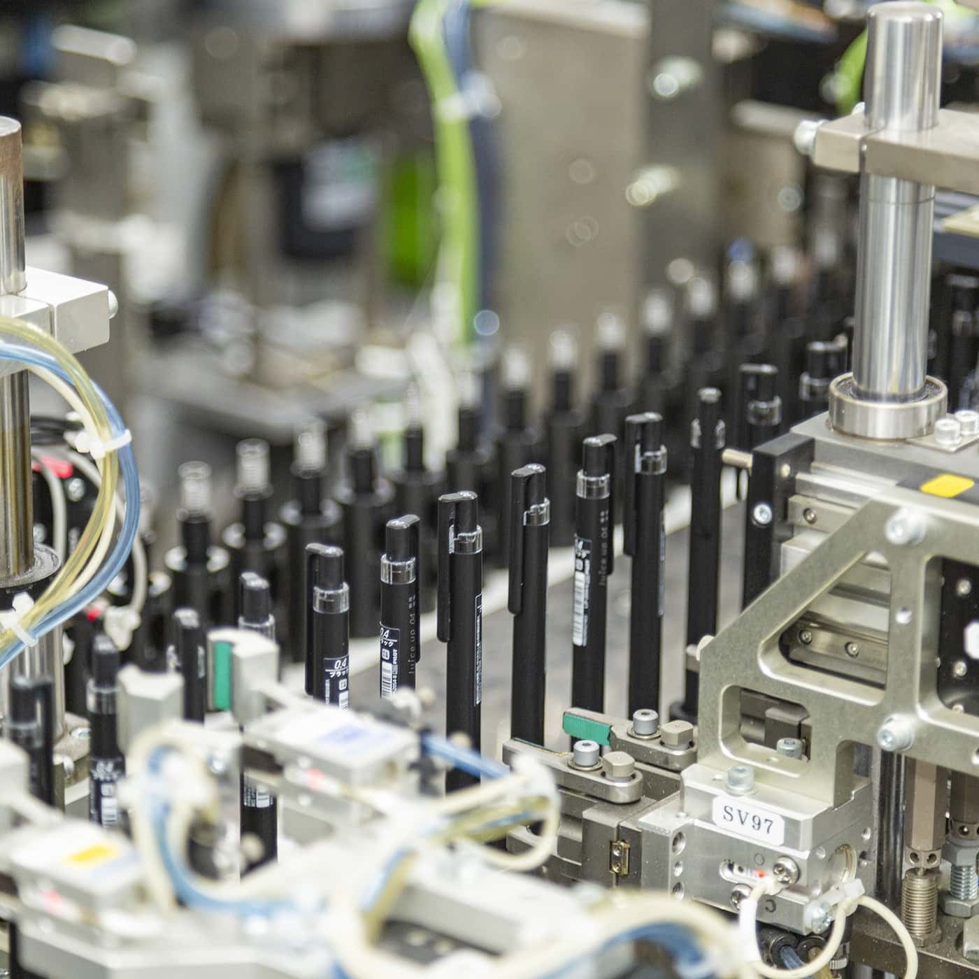 私たちが一番大切にしているのは、お客様にご満足いただけるものづくりをすること。そのために、基礎技術の研究に力を入れています。熱でインキが消える「フリクション」シリーズや、ジュースアップなどに使用している従来のペン先とは全く異なる構造の「シナジーチップ」など、世界初やオンリーワンの技術が次々生まれています。また、インキの開発や製品の外装設計に加え、生産設備も自社にて設計・製作を行うことで、開発から量産までのリードタイムの短縮や、安定した品質を確保できる体制を確立しています。