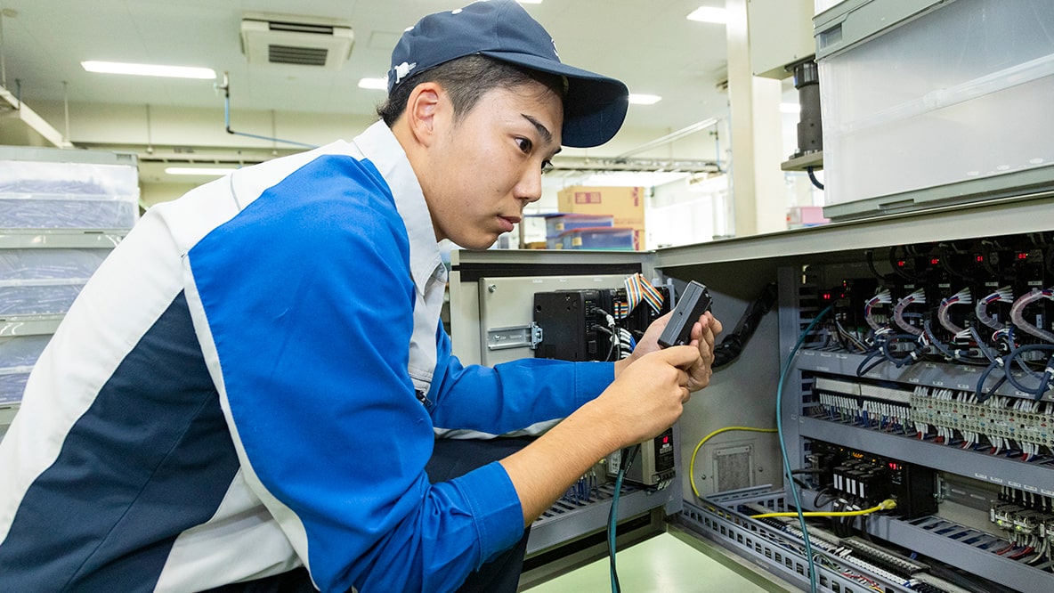 機械が正常に動くよう、点検やトラブル対応を行います。井口先輩の詳しい仕事内容は、先輩メッセ―ジで紹介していますのでぜひ読んでみてください。