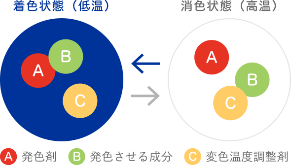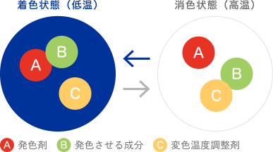 緑の葉が⼀夜にして真っ⾚に染まる紅葉を⾒たことをきっかけに色材研究が始まり、1975年に温度で⾊が変わるメタモカラーとして実現されました。メタモカラーは、「A.発⾊剤」、「B.発⾊させる成分」、「C.変⾊温度調整剤」を⼀つのマイクロカプセル内に封⼊した⾊材(顔料)です。A.発⾊剤は⾊を決める成分ですが、単体では発⾊せず、B.発⾊させる成分と化学的に結びつけることで発⾊します。C.発色温度調整剤はA.発色剤とB.発色させる成分を結び付ける温度を設定するもので、この種類を変えることにより温度をコントロールしております。メタモカラーは温度が上がると⾊が消えるのが基本で、⽂字を隠してメッセージを作ったり、⾊で温度を知らせたり、使⽤⽤途は様々です。50年近くにわたり研究開発を重ねてきた独⾃の熱変⾊材「メタモカラー」は、"⾒えない温度を⾒える化する"ことでお客様に貢献します。